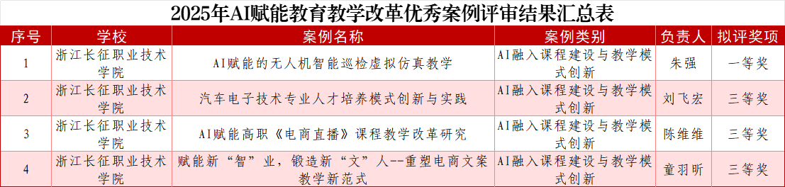 近日,浙江省高等教育学会智能教育分会公示了2025年数字化教育教学改革优秀案例评选结果,我校智能技术学院朱强团队《AI赋能的无人机智能巡检虚拟仿真教学》荣获一等奖、智能技术学院刘飞宏团队《<汽车电子技术专业人才培养模式创新与实践》、商务与贸易学院陈维维团队《AI赋能高职<电商直播>课程教学改革研究》和童羽昕团队《赋能新“智”业,锻造新“文”人--重塑电商文案教学新范式》获三等奖,全面展现了我校在数智化教学改革前沿的深厚实力和创新活力。